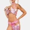 will have you going wild for the night. This western style waist belt has an iridescent material, studded hardware all over, side straps with rhinestone fringe, and an adjustable buckle closure.