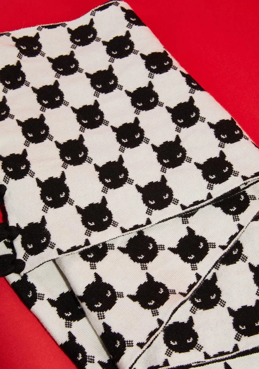 cuz you’ll be pawsitively purr-ty! This cozy knit scarf which has a checkered cat print all over and fringe trim.