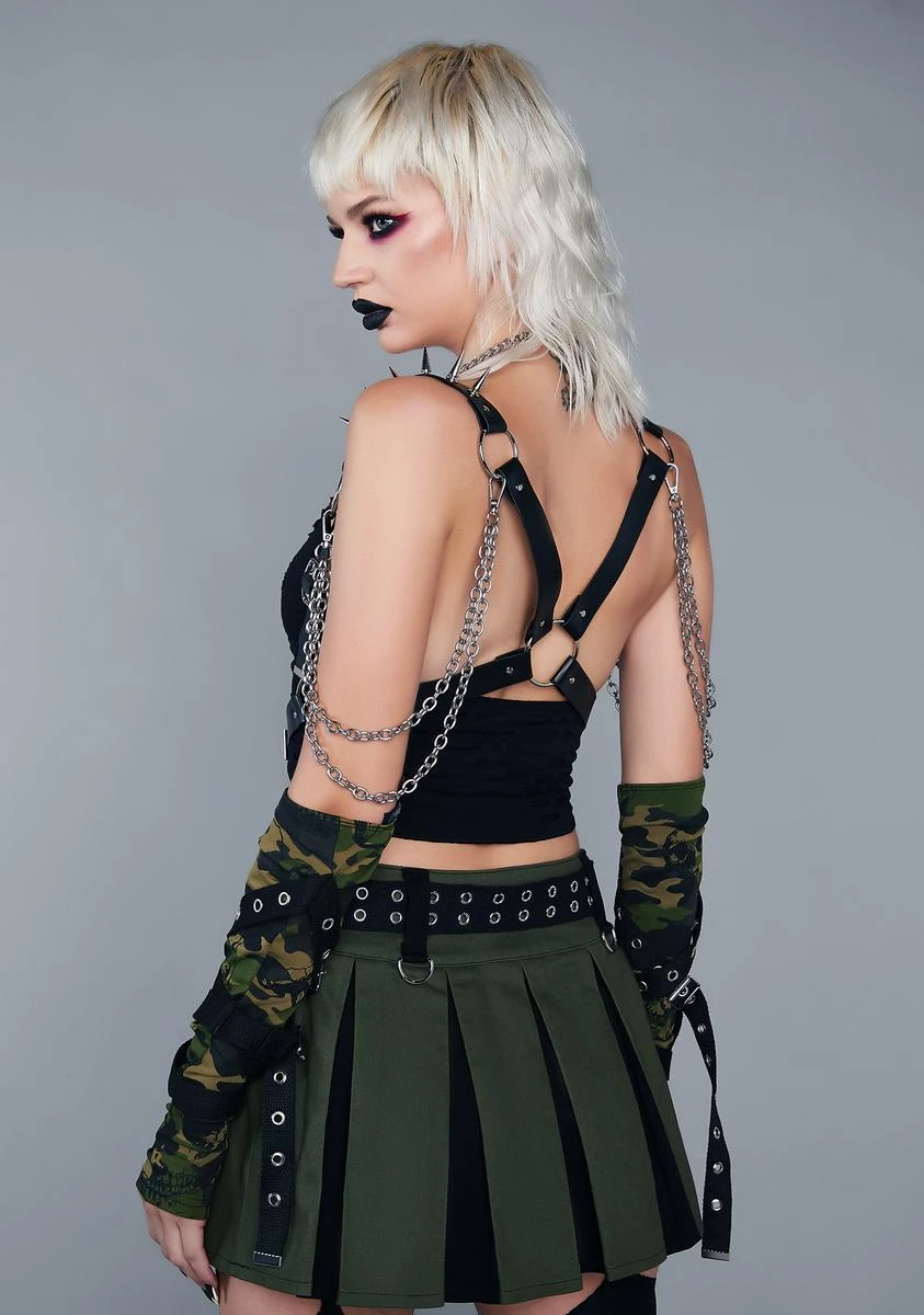 cuz you are one bad babe. Look sikk in this body harness that has a vegan leather construction, O-ring hardware, spiked detailing, detachable chains, adjustable shoulder straps, and buckle closures.