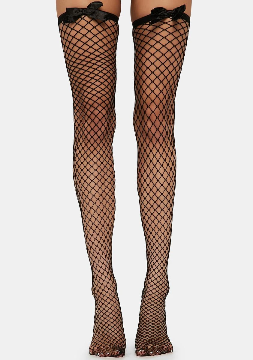 but you playin’. These thigh-high stockings have a sheer fishnet construction and bow appliques at top.