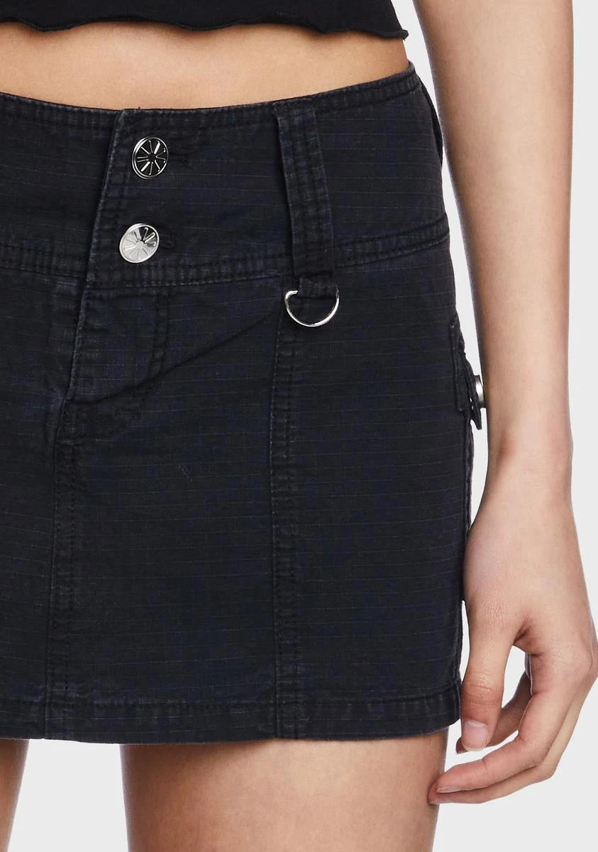 cuz you’re unforgettable. This mini skort has a mid-rise waist, cargo pockets with snap button closures, a zip fly closure with double buttons, and decorative D-ring hardware.