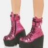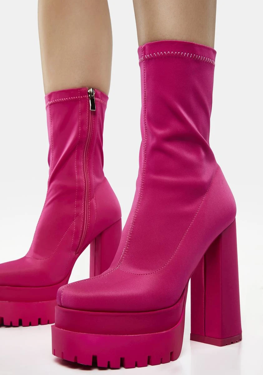 cuz you were not made to be subtle. These mid-calf boots have a slick textile construction, square toes, double-stacked tread platform soles, side zip closures with metallic pulls, and tall block heels.