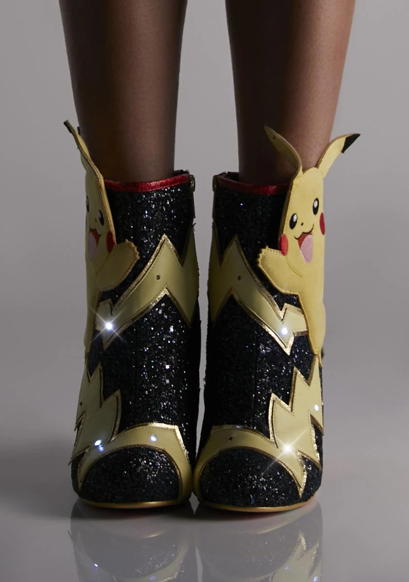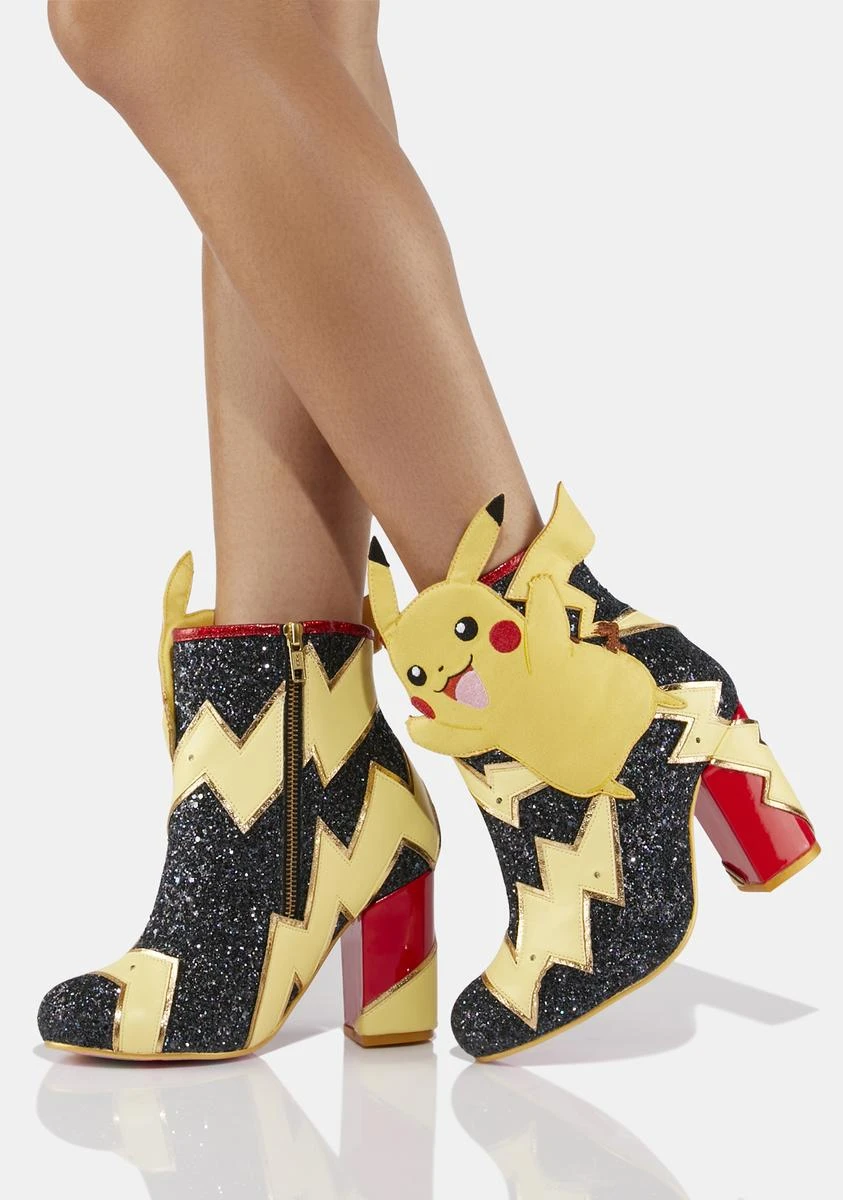 cuz I choose you Pikachu! These ankle booties have a vegan leather construction, a large Pikachu applique on the sides, non rechargeable LED lights around Pikachu that can be turned on and off, black glitter all over, red block heels, a cushioned insole, and side zip closures.