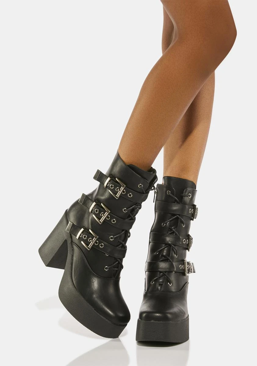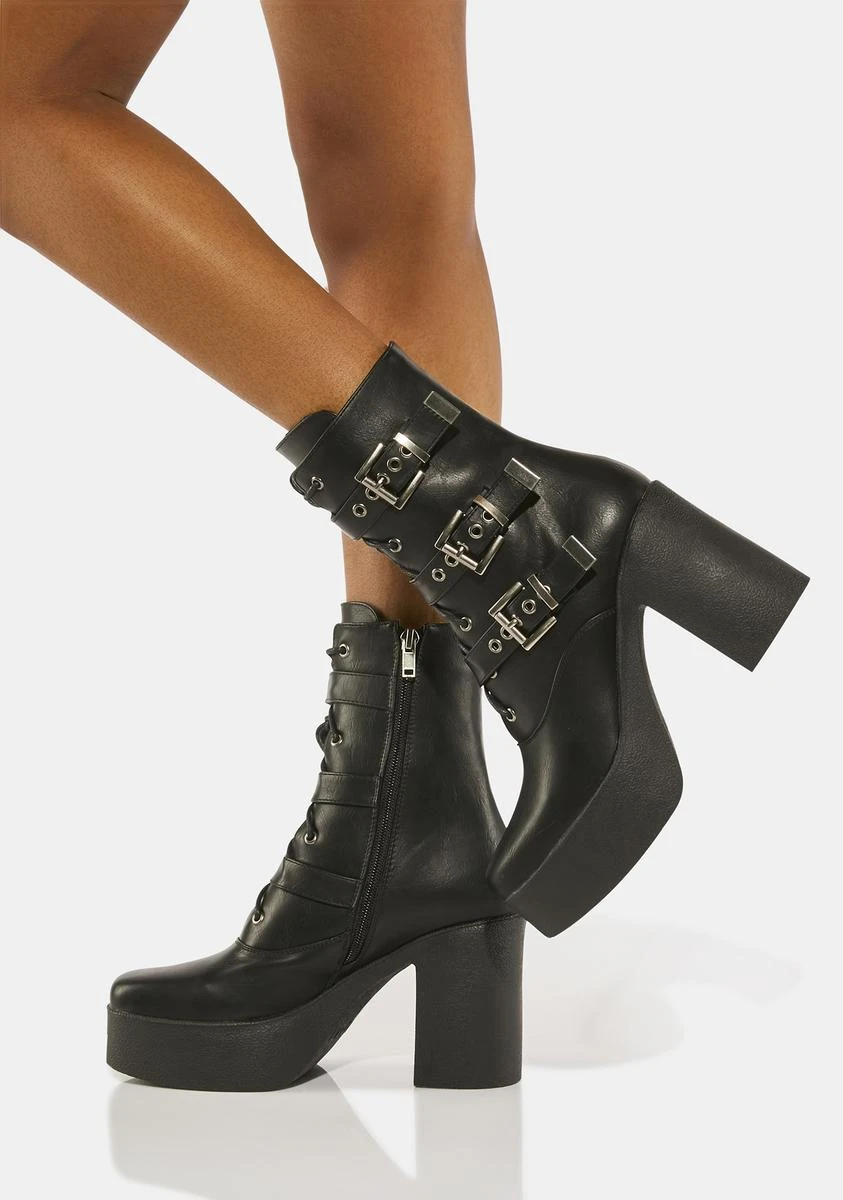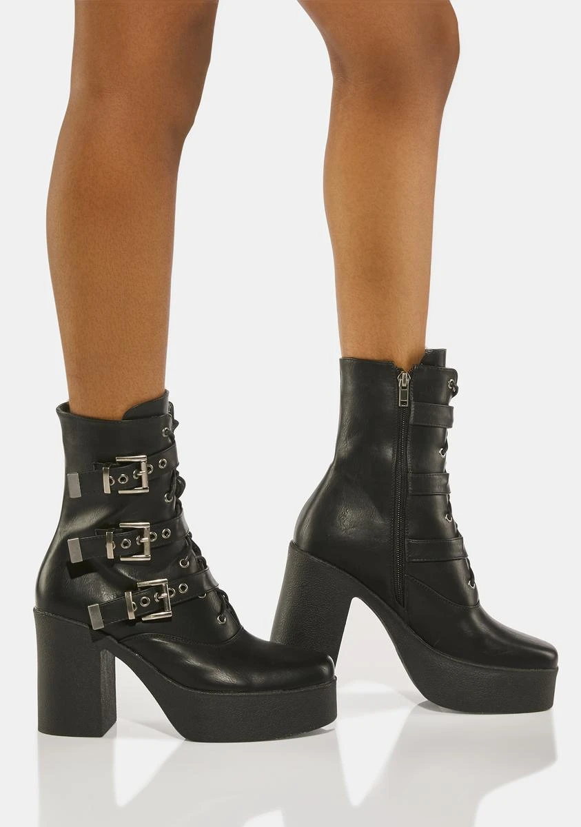 new shoes, who’s this? These platform ankle boots have a vegan leather construction, lace-up ties at front, adjustable buckled straps, and a block heel.