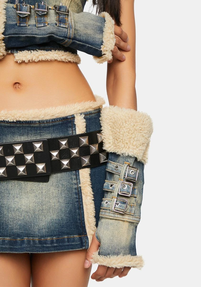leave ’em speechless. These fingerless gloves have a washed denim construction, buckle strap details, and faux shearling trim.