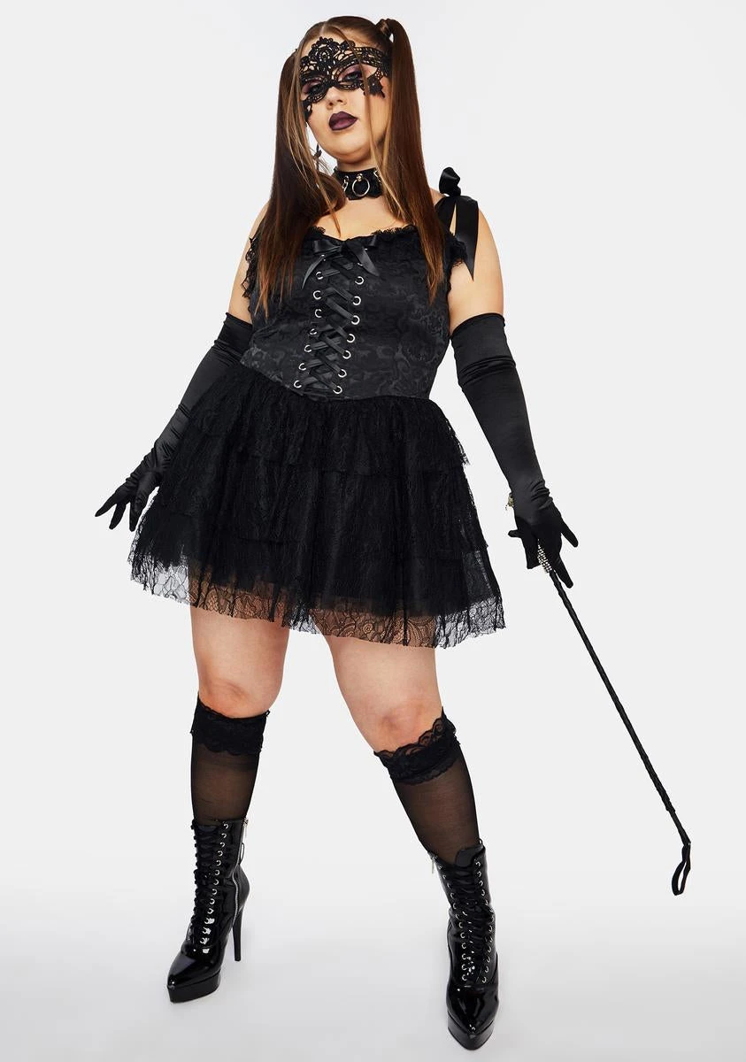 cuz everyone knows your famous last words. This gothic French queen costume has a tulle and lace mini dress with a corseted waistline, a matching lace mask, and a pair of gloves.