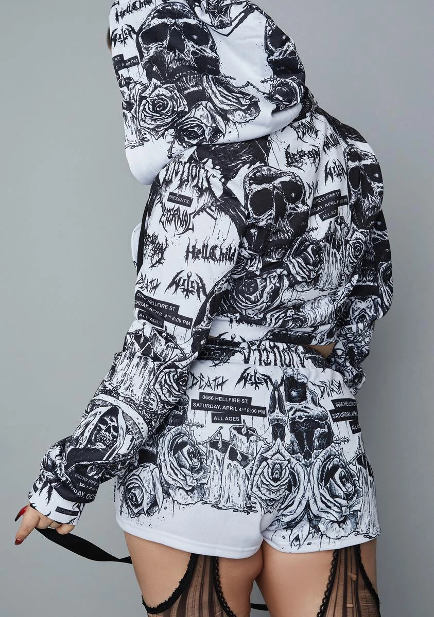 cuz let’s meet in the pit. Look sikk for your fave metal band with these sweat shorts that have an all over graphic flyer print, an elastic waistband, drawstring tie closures, a low waist fit, and removable straps.