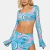 cuz youâre y2k iconic. This denim romper has a flared silhouette with layered ruffles and distressed hems, a front zip closure, and shaped cups with rhinestone fringe trim.