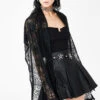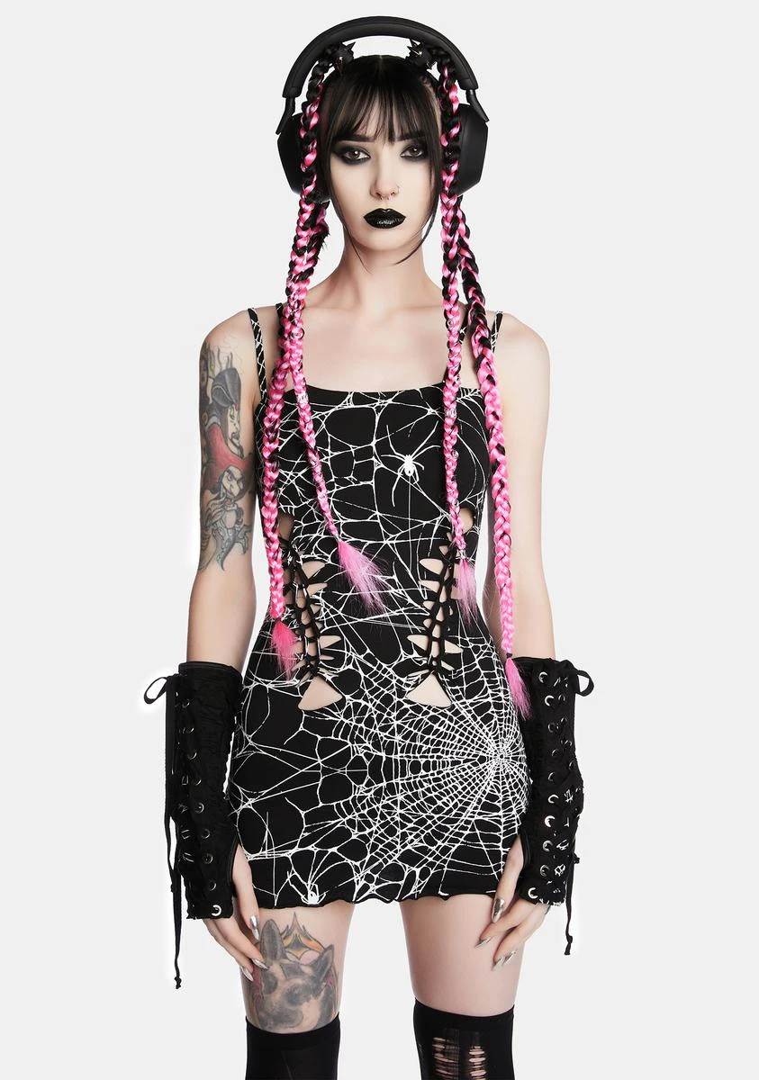 goin’ straight to your brain. These arm warmers have a shredded knit construction, spider web print front panels, and lace-up details with grommet hardware.