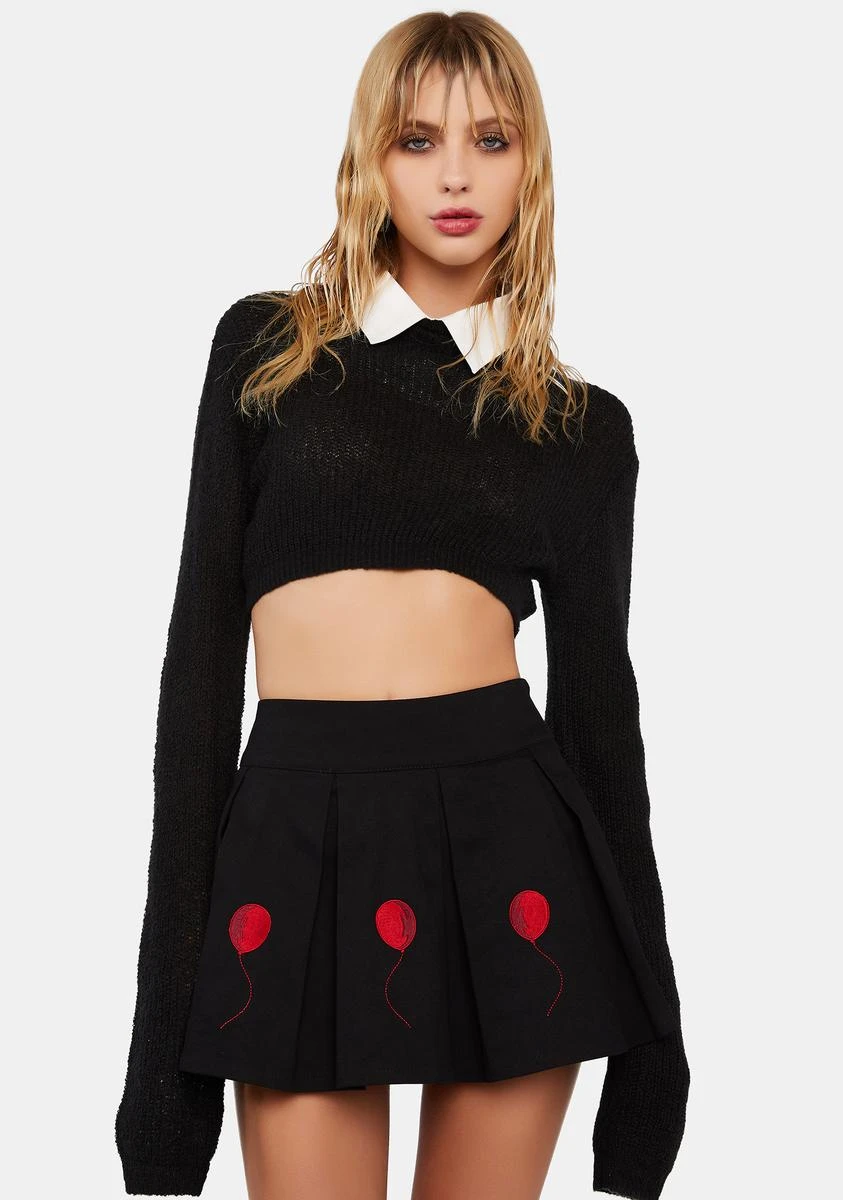 do you want a balloon too? This pleated mini skirt has a twill construction, a high waist fit, embroidered red balloon graphics, and a side zip closure.