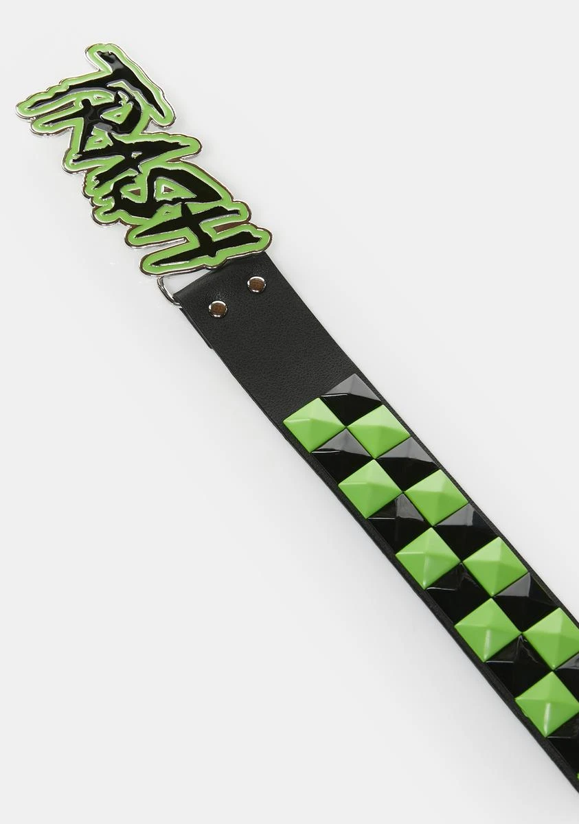 you’re not gonna settle for less. This vegan leather belt has neon green pyramid studs and a molded “trash” logo buckle closure.