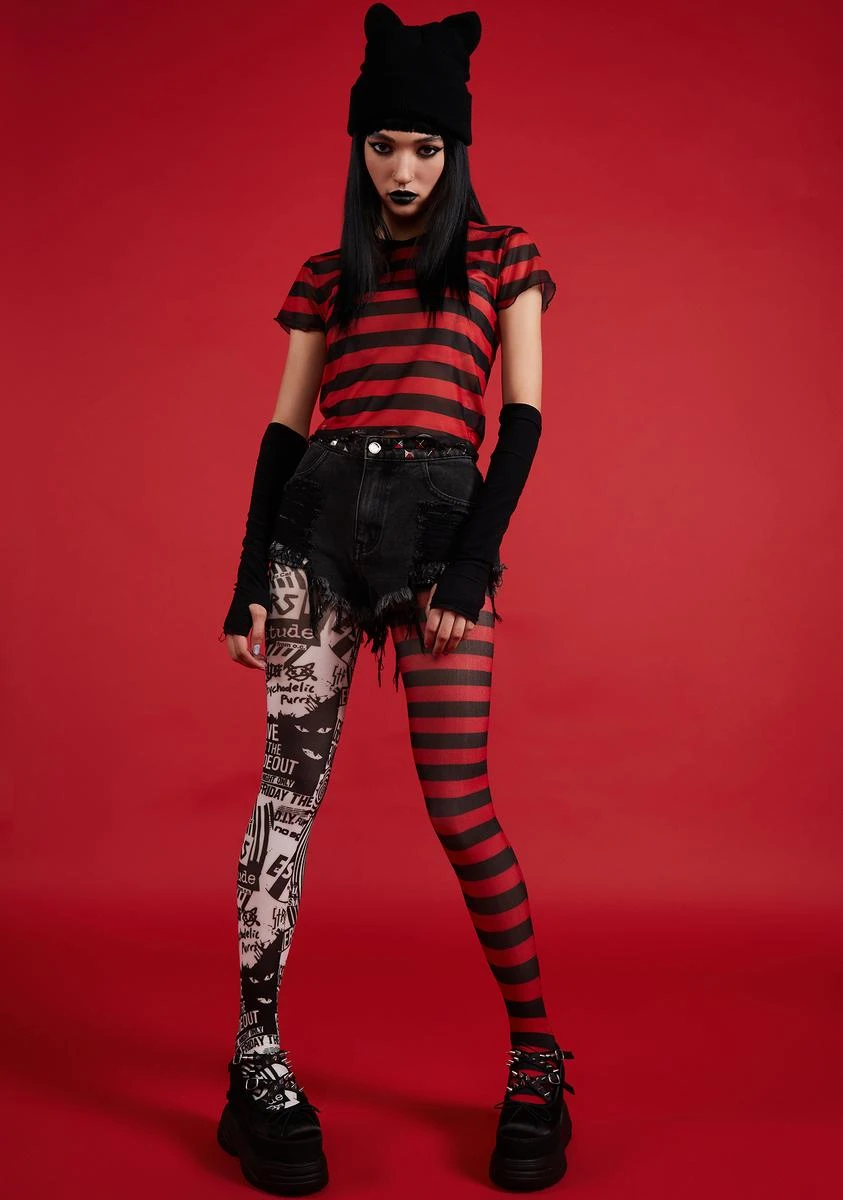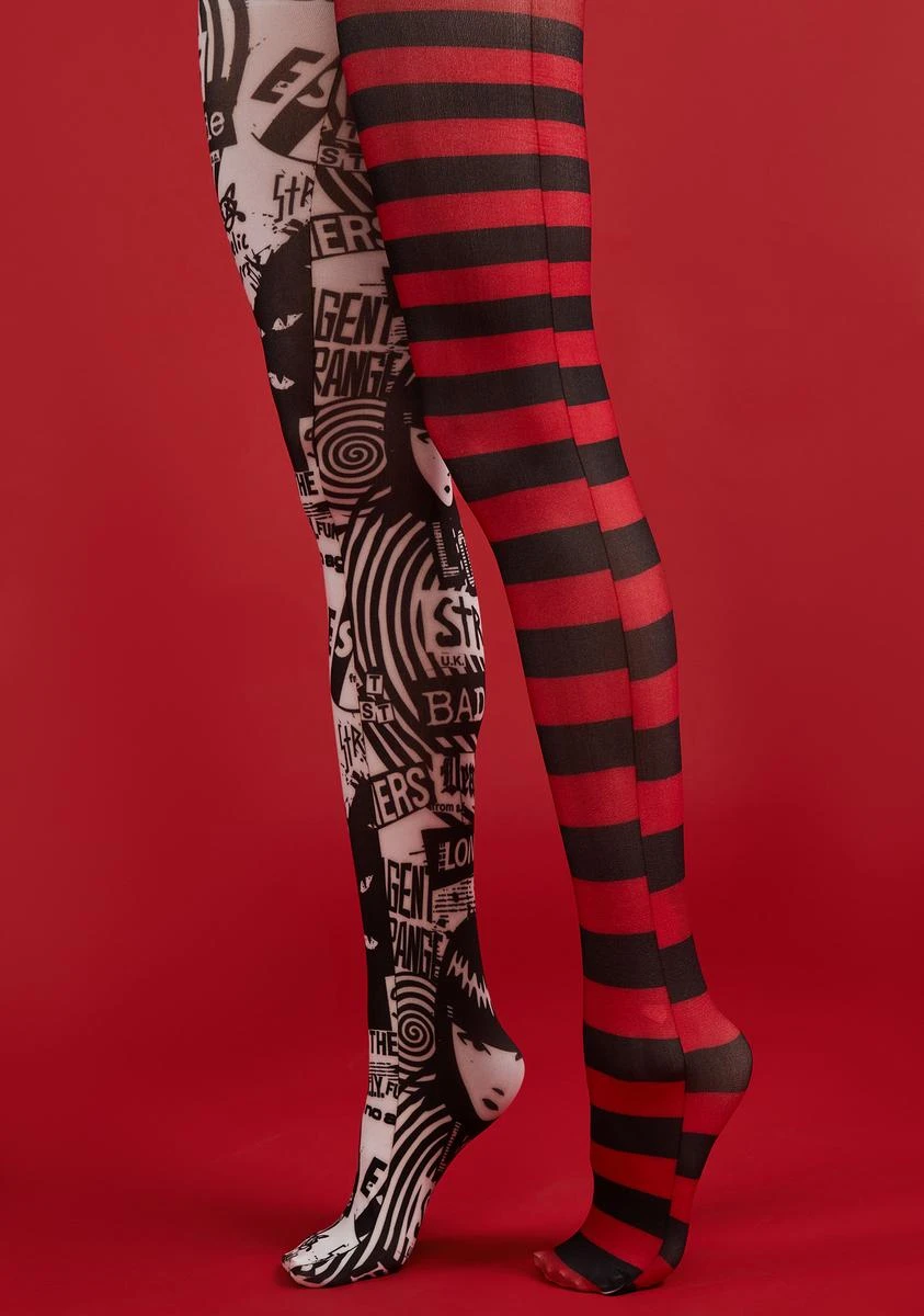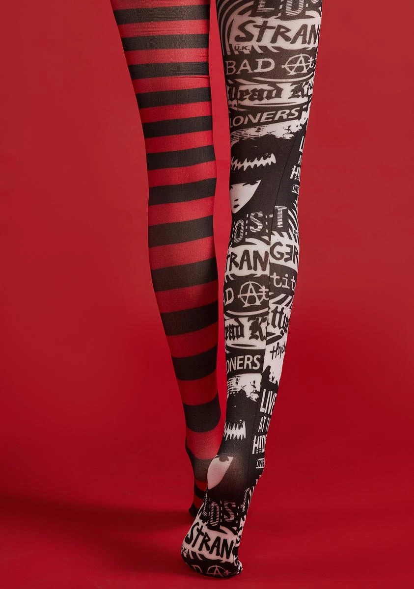 cuz I don’t care what you think of my fashion choices. Start a new trend in these stretchy tights which have a mismatched design with one striped and the other a black and white collage print.