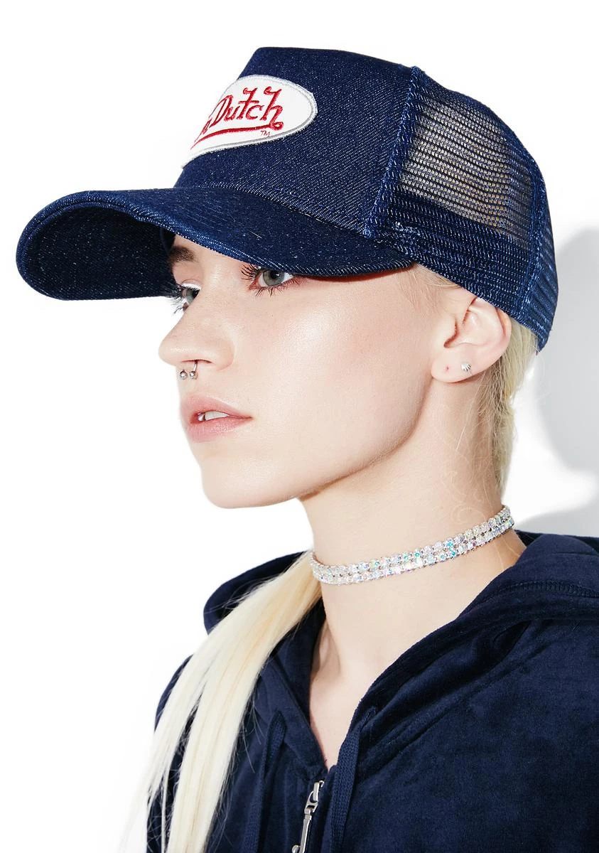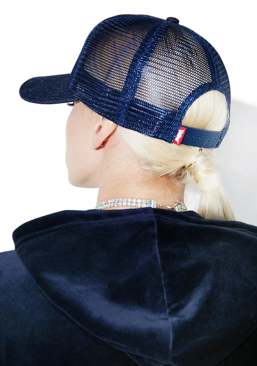 yer 2000s It Girl dreamz are finally cominâ true, babe. Take it back with this trucker hat that features a dark blue denim front panel with a dark blue mesh construction, adjustable back strap, and a red and white Von Dutch logo on the front.