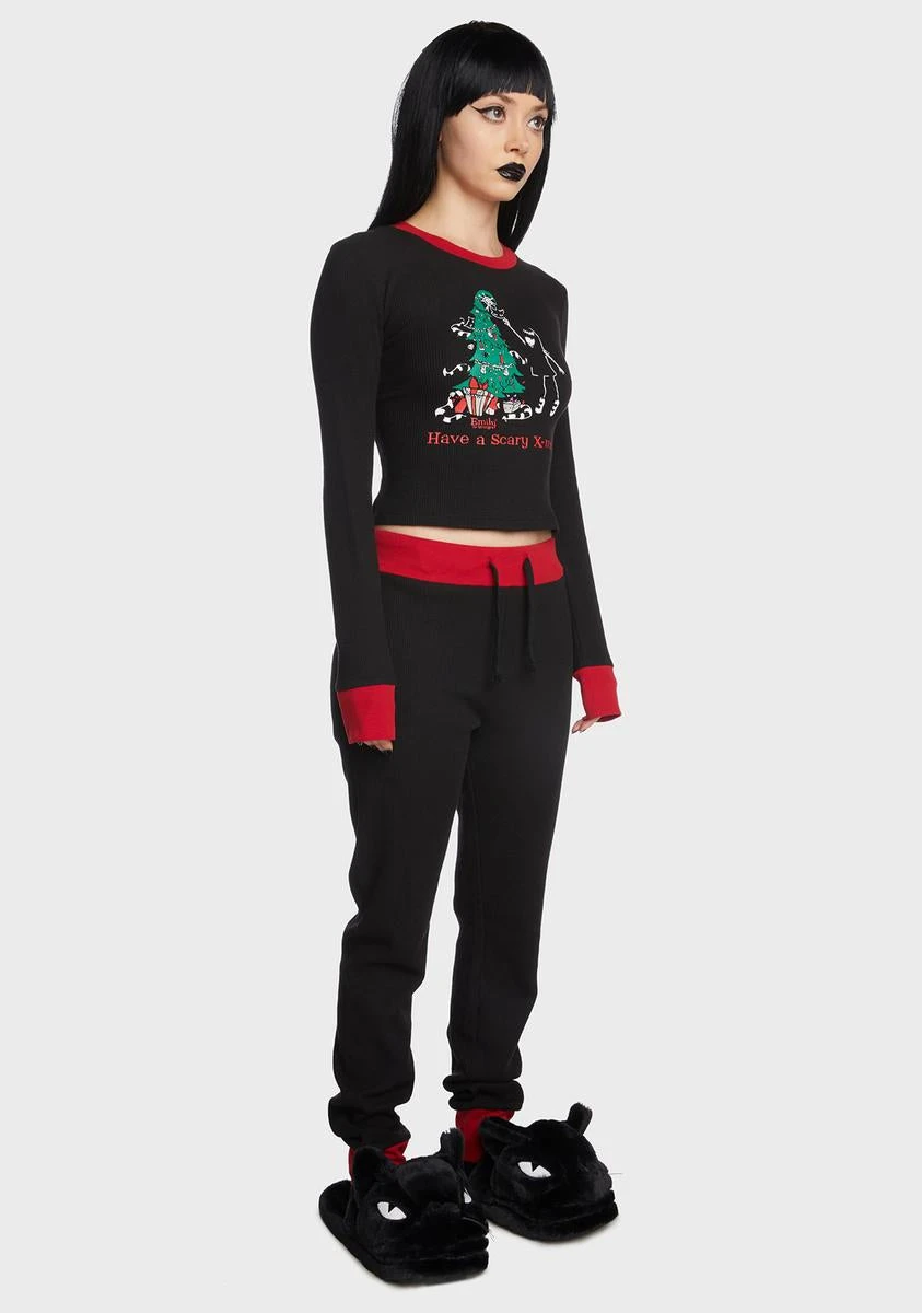 cuz you’re not one for holiday cheer. This set comes in a waffle knit construction, with a long sleeve crop top, drawstring pants, contrasting trim, and a graphic at front.